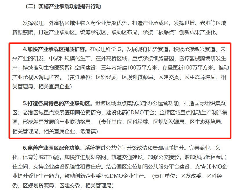 值得一提的是,《方案》提出要发挥张江、外高桥区域生物医药企业集聚优势,打造产业承载区;发挥世博、老港等区域资源禀赋,打造产业联动区。前者重点承接细胞基因、医疗器械跨境研发生产,推动生物医药智造空间建设;后者集聚总部办公运营功能,并重点发展医用同位素药物,建设化药CDMO平台,推动生产制造集聚。