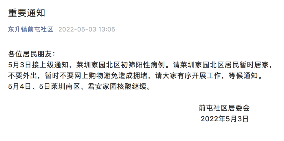 据“东升镇前屯社区”微信公众号,海淀区前屯社区居委会发布通知,5月3日接上级通知,莱圳家园北区初筛阳性病例。请莱圳家园北区居民暂时居家,不要外出,暂时不要网上购物避免造成拥堵,请大家有序开展工作,等候通知。