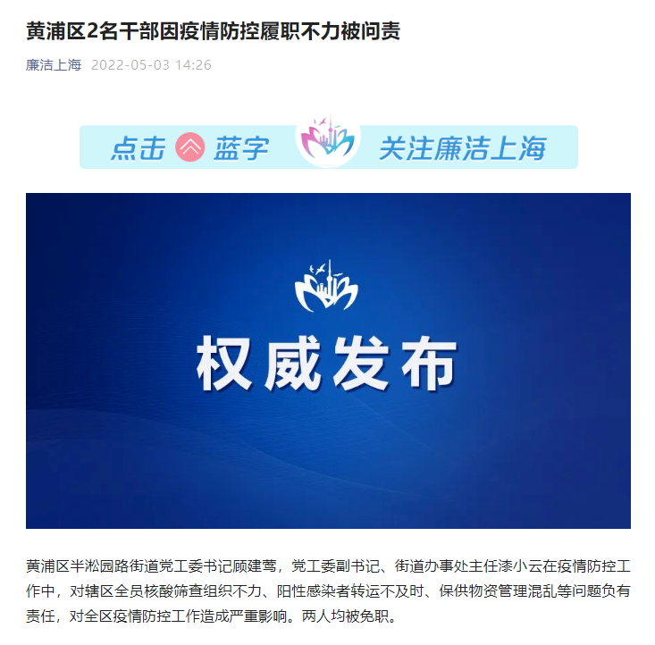 据“廉洁上海”通报:黄浦区半淞园路街道党工委书记顾建莺,党工委副书记、街道办事处主任漆小云在疫情防控工作中,对辖区全员核酸筛查组织不力、阳性感染者转运不及时、保供物资管理混乱等问题负有责任,对全区疫情防控工作造成严重影响。两人均被免职。