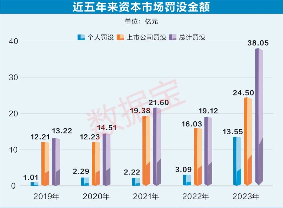 从处罚金额看,2023年A股公司及个人违规罚没金额合计38.05亿元,创近五年新高,比2022年的19.12亿元近乎翻倍。其中,对上市公司的罚没金额创下新高,为24.5亿元;对相关个人的罚没金额更是大幅增加3.39倍,一举超过10亿元大关,为13.55亿元。