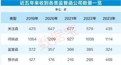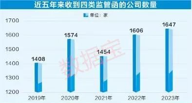 证券时报·数据宝统计,2023年共计有1647家公司收到交易所上述函件,这一数量创下近五年来新高。和往年类似,2023年“受到关注”的公司包括部分千亿元市值的大企业,体现出监管规则面前大小企业平等的原则。