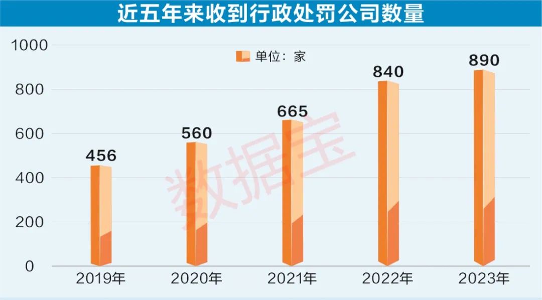 证券时报·数据宝统计,2023年共计有890家A股公司披露了由各级监管机构出具的行政处罚文件,共计1551份,两项数据均创出近五年来新高。