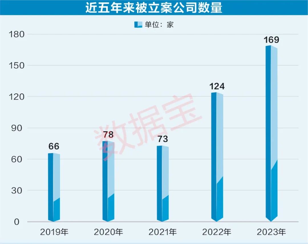 伴随全面注册制的推进,监管对资本市场的整治力度日渐强化。以被证监会立案调查的上市公司为例,2023年,A股市场发布被立案调查相关公告的上市公司共计169家,该数字创下近五年新高,比2022年的124家增长36.29%。