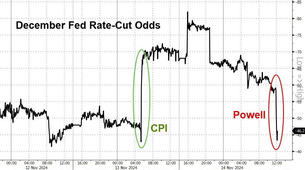 在鲍威尔发表讲话后,美国股市收盘接近盘中低点,美元则与美债收益率一同大涨,ICE美元指数创下了一年来的最高位。交易员将美联储12月降息的概率预期从前一天的80%降至了50%左右,这与前一天的CPI发布日形成了鲜明对比。