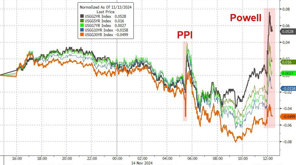 大多数期限的美债收益率在隔夜鲍威尔讲话后都出现了上涨,尤其是短债收益率迅速冲高,2年期美债收益率一度迅速反弹8个基点至4.36%。