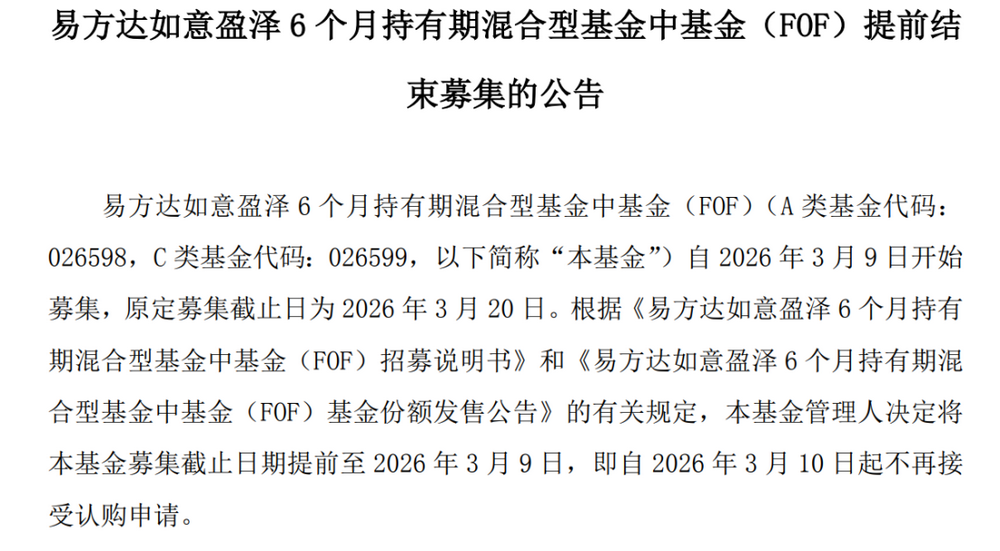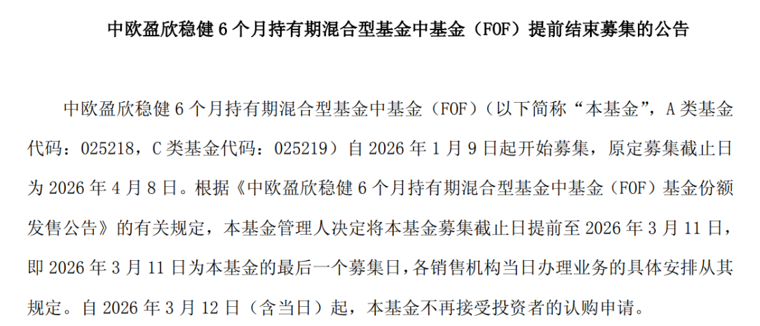 3月11日,中欧基金宣布,从1月9日开始募集的中欧盈欣稳健6个月持有混合FOF,募集截止日由原定的4月8日,提前至3月11日。而前一日,招商基金旗下的招商智盈优选6个月持有混合FOF也提前结募,募集截止日原定为3月18日。再往前,易方达如意盈泽6个月持有混合FOF在3月9日“一日售罄”。