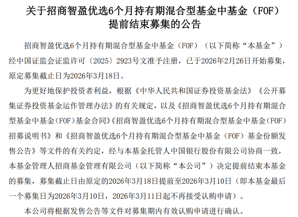 具体来看,招商智盈优选6个月持有FOF是从2月26日开始募集,随着提前结募的宣布,该基金的募集规模缩短至13天。此次提前结束募集,是管理人主动控制规模,有助于后续产品稳定运作。财联社记者向渠道人士了解到,此次募集规模约为30亿元。