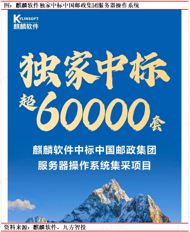 事件二:信创政策持续完善,招采需求拐点逐渐呈现,行业景气向上。7月27日,麒麟软件公众号发布,麒麟软件独家中标中国邮政集团服务器操作系统采集项目,采购量超六万套,进一步扩大了麒麟操作系统生态。作为信创龙头,麒麟软件此次大单落地,释放出信创本土替代加速推进的重要信号。
