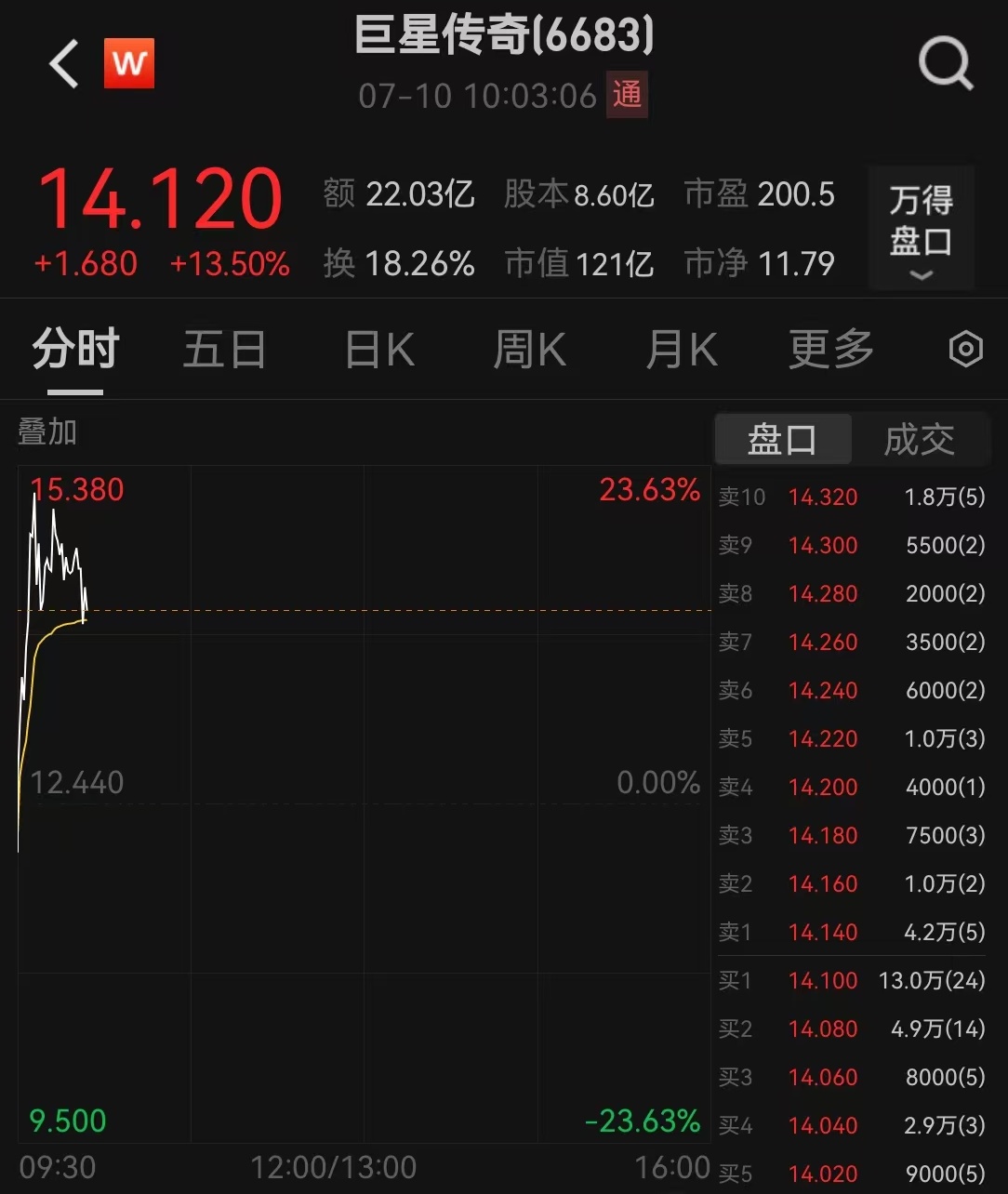 7月10日,港股巨星传奇股价再度拉升,一度涨超23%,截至发稿,巨星传奇涨超13%。昨日,巨星传奇收涨94.38%。