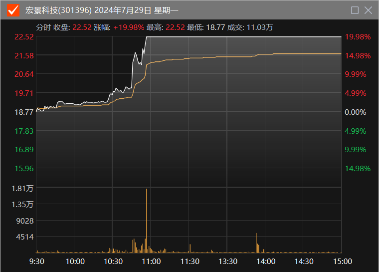 二级市场上,宏景科技周一收盘20CM涨停。