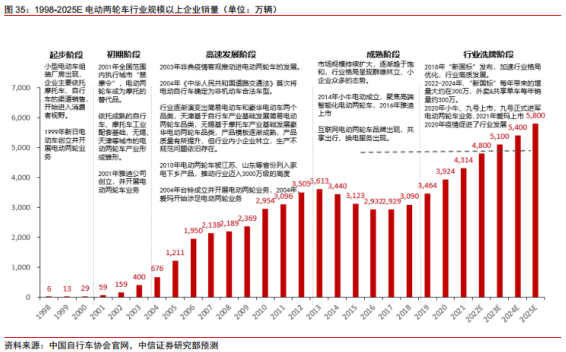 中信证券李子俊在8月24日研报中表示,根据“新国标”颁布后,针对各省市区公布的上牌量数据统计,推算实际年销量约处于5000-6000万辆/年。