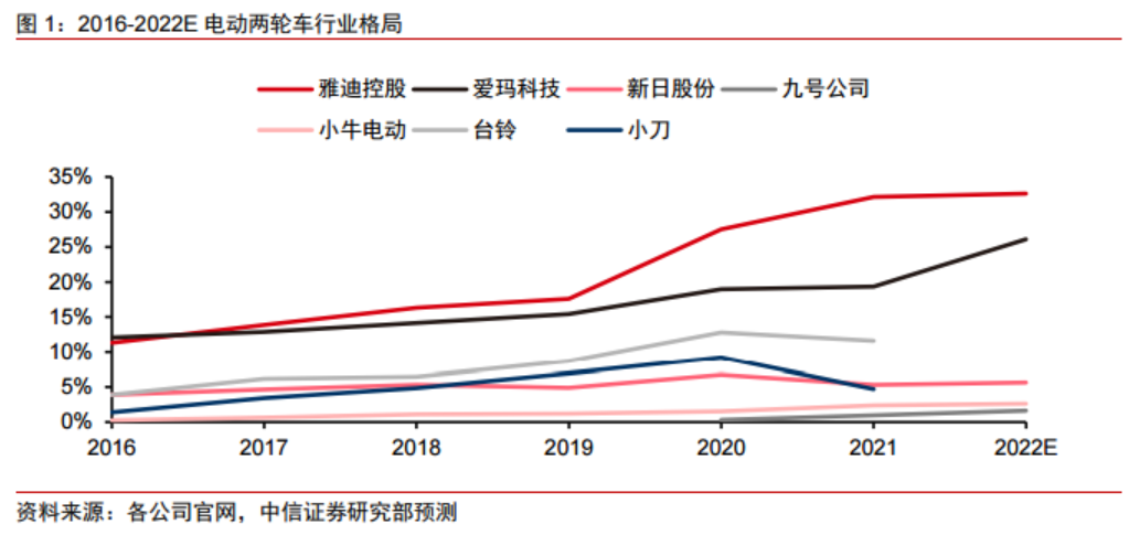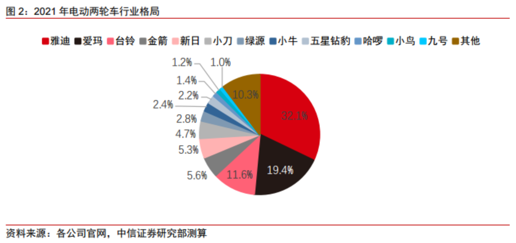 李子俊研报中表示,2022年以来,在电动两轮车总需求继续提升的背景下,行业集中度继续保持上升,年底雅迪、爱玛合计市占率有望达到6成。而2021年行业内9家百万级企业的合计市占率为86%,相较而言,行业已逐渐进入格局集中的新阶段,李子俊预计,未来3年内雅迪、爱玛市场份额合计约70%+,九号、小牛等电动两轮新势力及其他区域品牌合计占据15%左右的细分市场。