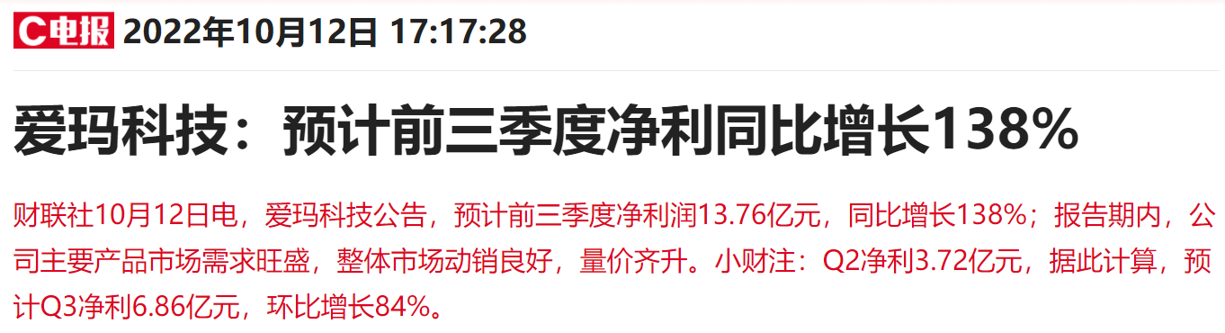爱玛科技周三晚间公告,预计前三季度净利润13.76亿元,同比增长138%。据计算,前三季度业绩已超去年全年2倍;Q3净利预计同比增长160%,据测算环比增长84%。公司股价也在第二天收获一字涨停板。