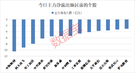 从今日的主力动向来看,5200余只A股中,主力资金净流出超亿元的个股有65只,多只流出额居前的个股均属CPO概念,其中中际旭创、科大讯飞、华工科技的主力净流出额位居前三,分别流出10.42亿元、9.17亿元和7.88亿元。