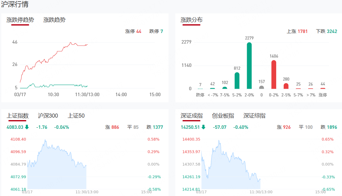 市场早盘冲高回落,三大指数均翻绿。沪深两市半日成交额1.37万亿,较上个交易日缩量1404亿。盘面上热点较为杂乱,全市场超3400只个股下跌。从板块来看,绿电概念反复活跃,华电辽能2连板,节能风电5天3板,江苏新能、浙江新能涨停。房地产板块盘中走高,中洲控股、京能置业涨停。太空光伏概念快速拉升,协鑫集成、雅博股份涨停。钢铁板块表现活跃,安阳钢铁、酒钢宏兴双双涨停。大金融股震荡走强,爱建集团涨停。下跌方面,CPO概念震荡走弱,天孚通信、光库科技等多股大跌。