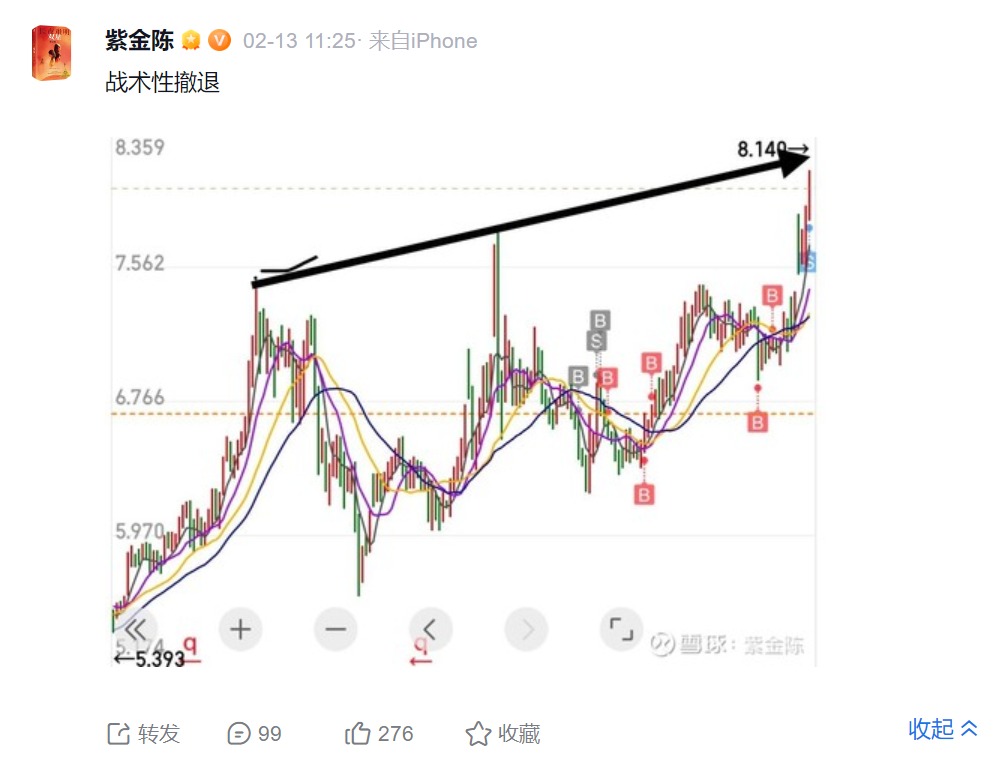 2月17日,紫金陈发帖称,“喜滋滋地每股赚1.25(元),转头少赚1块钱。”就在2月13日,他发帖表示卖出中国联通(港股)“战略性撤退”,没想到他撤退后,中国联通(港股)大象起舞,两天大涨十几个点。