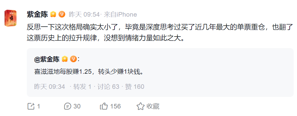 2月17日,紫金陈发帖,对卖飞中国联通(港股)表示反思,“反思一下这次格局确实太小了,毕竟是深度思考过买了近几年最大的单票重仓,也翻了这票历史上的拉升规律,没想到情绪力量如此之大。”