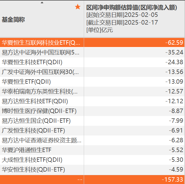 从净赎回较多的跨境ETF看,从2月5日至17日,短短9个交易日,华夏恒生互联网ETF净赎回高达62.59亿元,易方达中概互联网ETF净赎回35.24亿元,华夏恒生科技ETF净赎回24.38亿元。