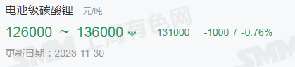 据上海有色网,现货价格方面,11月30日,电池级碳酸锂平均价下降1000元/吨至13.1万元/吨。