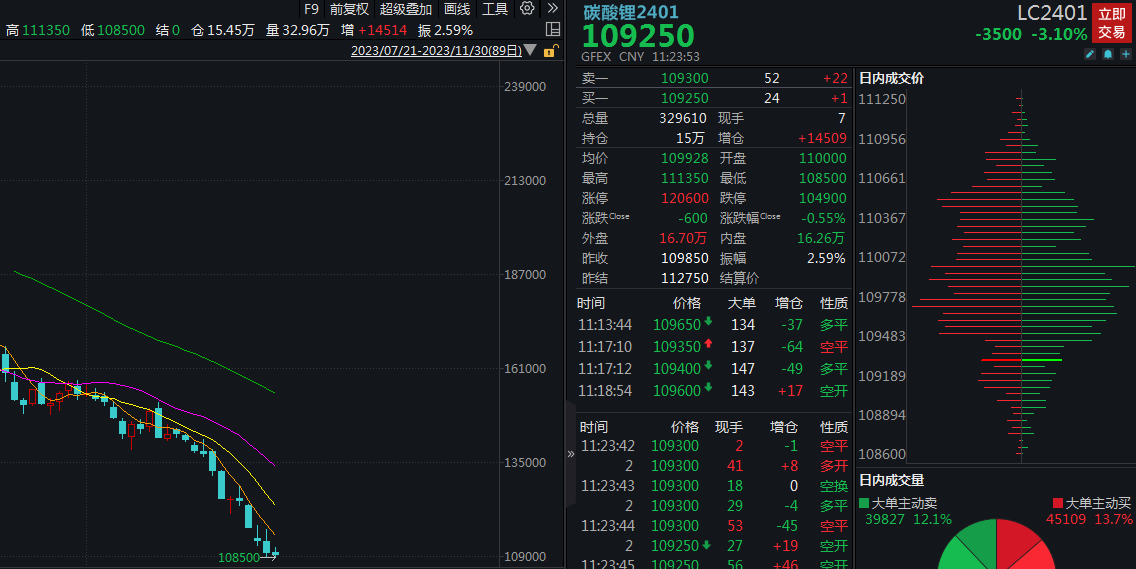 11月30日,碳酸锂期货主力合约下跌,最低下探至108500元/吨,创上市以来新低,截至发稿,小幅回升至109250元/吨。