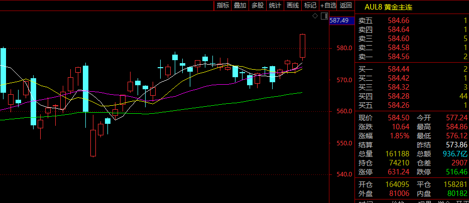 今日,国内黄金期货主力合约也放量高开高走,截至发稿,涨近2%,最高摸至584.86元,逼近历史最高点;白银期货主力合约最高也大涨逾4%,最高达到7425元。
