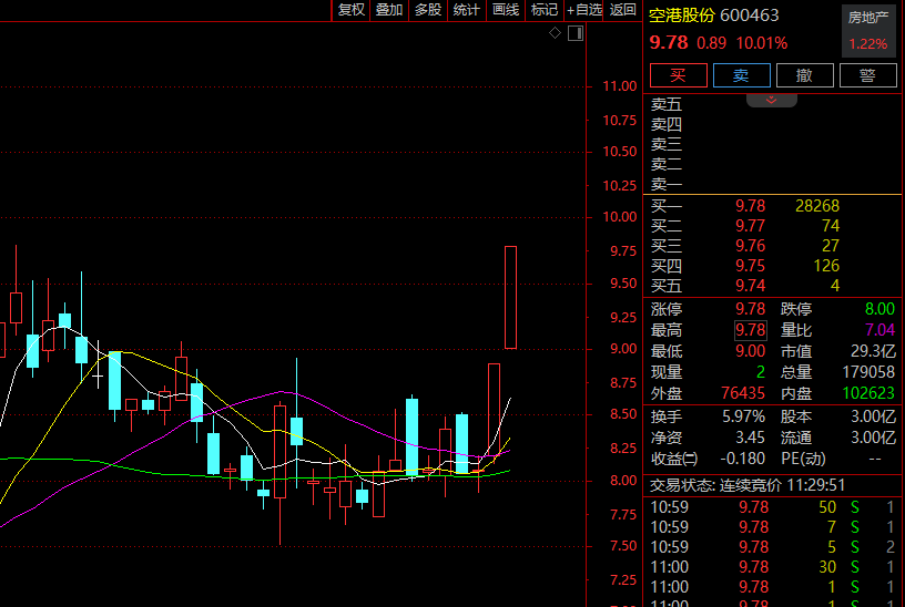 房地产早间表现活跃,板块指数放量跳空高开高走,盘中一度涨近2%,半日成交接近昨日全天成交。电子城开盘一字涨停,空港股份则仅用约10分钟就垂直涨停,这亦是其连续第2个涨停,中交地产、海泰发展等也快速封板。