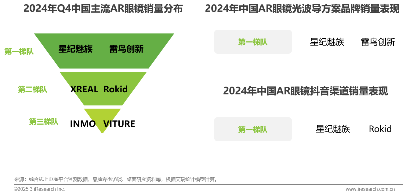 2024年Q4,中国AR眼镜迎来爆发,头部品牌效应愈发凸显,雷鸟创新、星纪魅族、XREAL、Rokid、INMO等头部品牌销量占据绝大部分市场份额,目前市场集中度比较高。其中,星纪魅族品牌凭借2024年Q4发布的两款全新产品的销量,目前销量占据第一梯队,展现出非常强的市场竞争力。从细分维度看,星纪魅族在2024年光波导方案的AR眼镜产品的销量占据市场第一梯队。从抖音渠道看,星纪魅族品牌表现也是第一梯队。