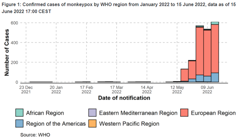 根据世界卫生组织6月17日的最新更新,2022年1月1日至6月15日期间,世卫组织五个区域的42个国家累计报告了2103例实验室确诊病例、1例疑似病例和1例死亡。2022年5月以来报告了大多数病例(98%)。