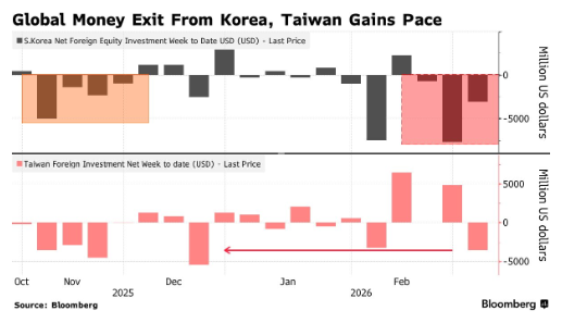 继上月创纪录抛售137亿美元韩国股票后,本周海外投资者再减持约31亿美元韩股。在中国台湾省,外资抛售规模达36亿美元,市场正遭遇去年12月底以来最大单周资金外流。