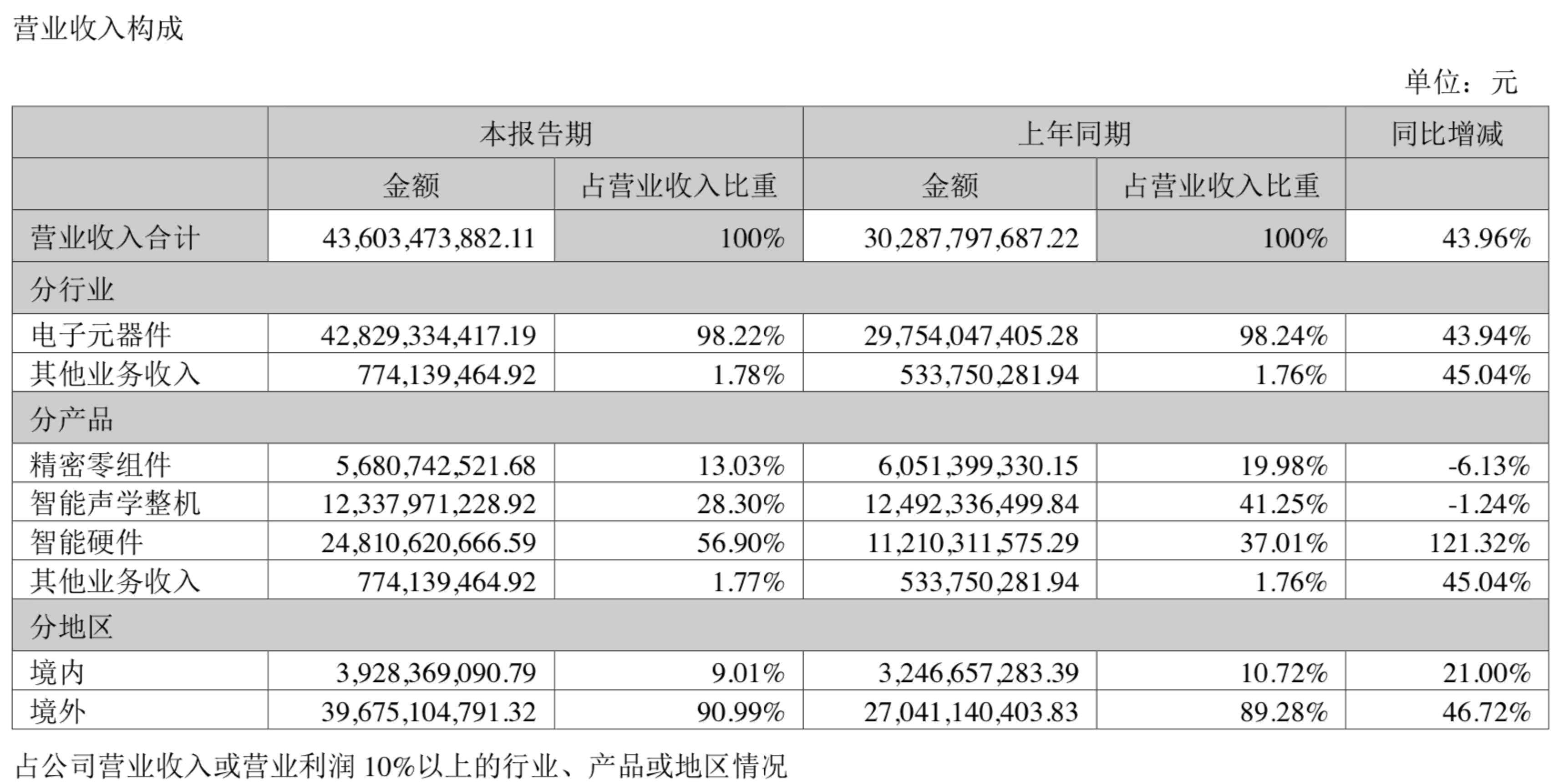 歌尔股份2022年半年报则显示,“智能声学整机”的收入有123.38亿元,占营业收入比重的28.30%,2021年上半年甚至超过40%。