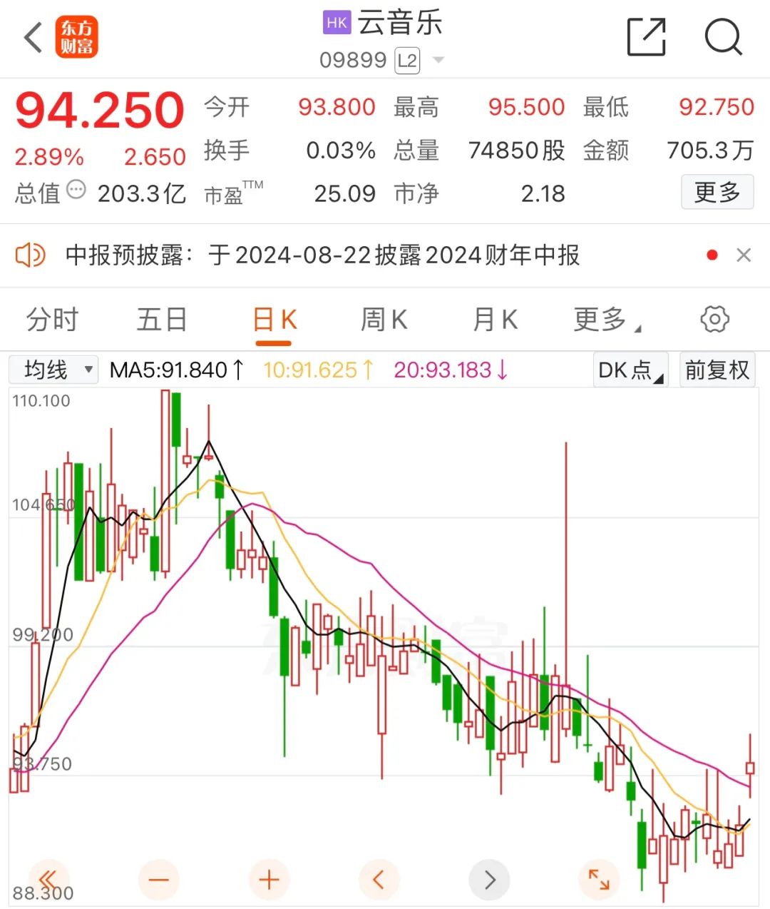 股价方面,今日港股云音乐上涨2.89%,收盘报94.25港元,最新市值203.3亿港元。