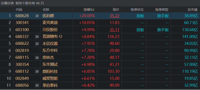 今日(10月21日),仪器仪表概念再度活跃,截止收盘,板块指数涨幅超3%,且位居两市板块涨幅首位。个股方面,优利德、川仪股份封板涨停,麦克奥迪涨近10%,普源精电、禾信仪器、东方中科、思林杰等股涨幅居前。其中,优利德今日时隔4日再获20cm长阳,且近8个交易日累计上涨近60%。