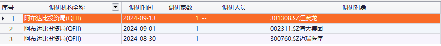 下半年以来,阿布达比投资局还调研了三家A股上市公司。Choice数据显示,阿布达比投资局在8月30日调研了迈瑞医疗,9月1日调研了海大集团,9月13日调研了江波龙。