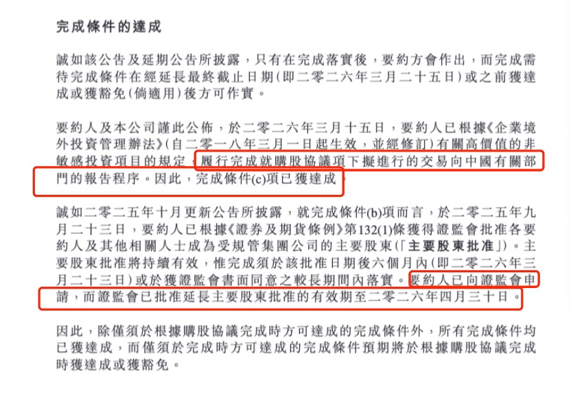 真正的考验在于两地的监管审批。按照两地监管规定,此类跨境并购需同时获得香港证监会及中国内地相关部门的批准。2025年9月23日,香港证监会率先完成了审批程序,给出了有效期至2026年3月23日的批准函。然而,内地的审批流程较为复杂,涉及国家发展改革委的报备等多个环节。