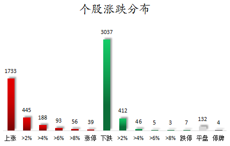 截至收盘,沪深两市合计1733只个股上涨,3037只个股下跌,平盘个股132只,停牌的个股4只。不含当日上市新股,共有39只个股涨停,7只个股跌停。连续涨停天数看,ST明诚已连收5个涨停板,连续涨停板数量最多。