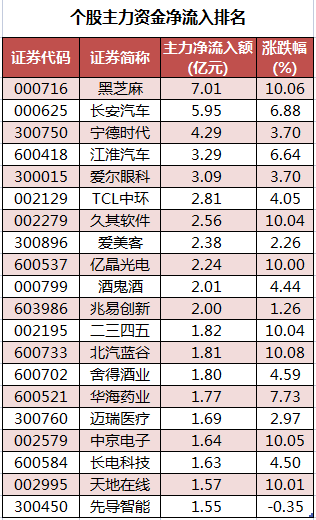 个股来看,今日有1875只个股获主力资金净流入,其中,29股获主力资金净流入超1亿元。黑芝麻获主力资金净流入最多,净流入金额为7.01亿元;主力资金净流入居前的个股还有长安汽车、宁德时代、江淮汽车、爱尔眼科、TCL中环,净流入金额分别为5.95亿元、4.29亿元、3.29亿元、3.09亿元、2.81亿元。