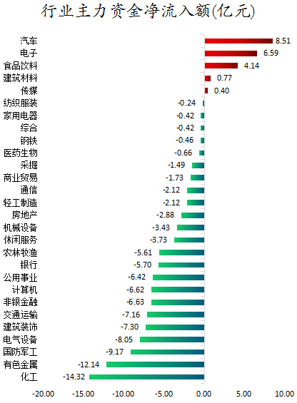 从行业板块来看,申万所属的28个一级行业,今日有5个行业板块主力资金呈现净流入,其中,汽车行业板块主力资金净流入最多,净流入金额为8.51亿元;行业板块主力资金净流入居前的还有电子、食品饮料,净流入金额分别为6.59亿元、4.14亿元。23个行业板块主力资金呈现净流出,其中,化工行业板块主力资金净流出最多,净流出金额为14.32亿元;行业板块主力资金净流出靠前的还有有色金属、国防军工、电气设备、建筑装饰、交通运输,净流出金额分别为12.14亿元、9.17亿元、8.05亿元、7.3亿元、7.16亿元。