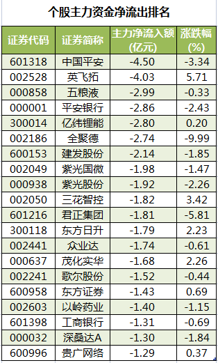 此外,3002只个股被主力资金净卖出,其中,34股被主力资金净卖出超1亿元。主力资金净流出最多的个股是中国平安,净流出金额为4.5亿元;主力资金净流出居前的个股还有英飞拓、五粮液、平安银行、亿纬锂能、全聚德,净流出金额分别为4.03亿元、2.99亿元、2.86亿元、2.8亿元、2.74亿元。