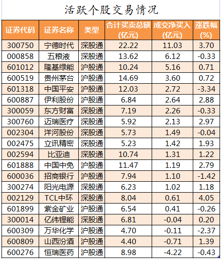 活跃个股方面,北向资金净买入较多的有宁德时代、五粮液、隆基绿能、贵州茅台、中国平安,净买入金额分别为11.03亿元、6.12亿元、5.16亿元、3.6亿元、2.72亿元。北向资金净卖出的有恒瑞医药、山西汾酒、万华化学、亿纬锂能,净卖出金额分别为4.22亿元、0.71亿元、0.11亿元、0.04亿元。