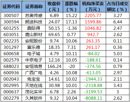 盘后龙虎榜数据显示,今日机构席位资金合计净卖出约1.05亿元。其中,净买入的个股6只,净卖出的个股8只。机构净买入最多的股票是苏奥传感,净买入金额约2205.77万元;机构净买入居前的还有朗进科技、鼎际得等股。机构净卖出最多的股票是久其软件,净卖出金额约8088.11万元;机构净卖出居前的还有茂化实华、天地在线等股。