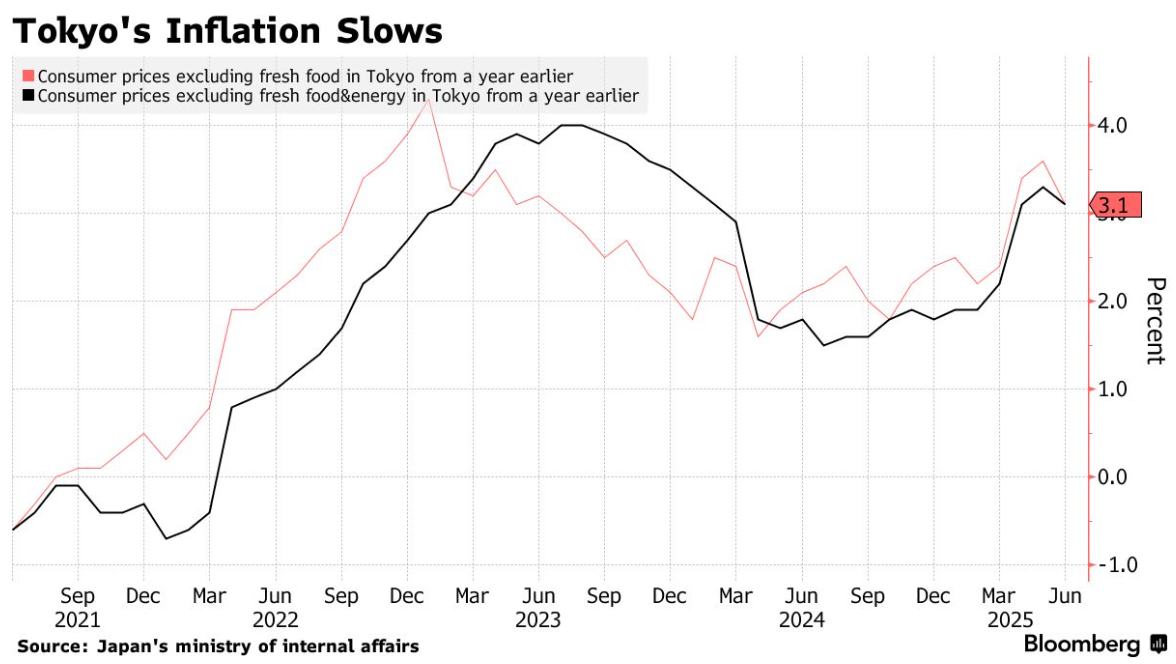 东京通胀四个月来首次放缓,因能源价格涨势减弱,且市政府在全国大选前减免了部分家庭水费。此次选举很可能以生活成本危机为中心议题。周五公布的数据显示,6月份东京都剔除生鲜食品的消费者价格同比上涨3.1%,低于经济学家预估中值3.3%。