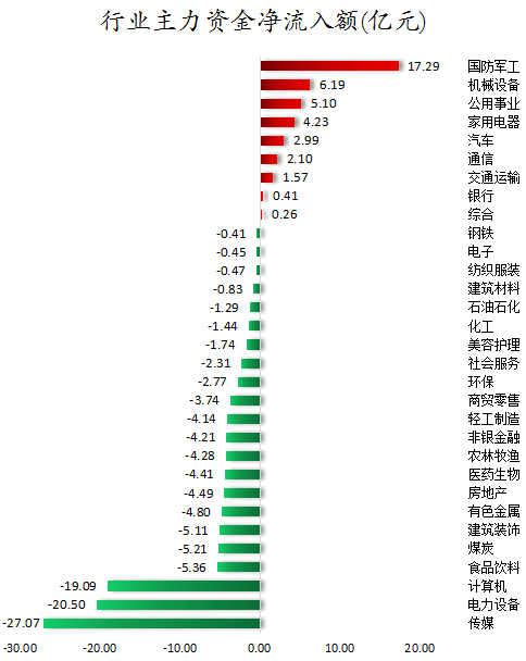 从行业板块来看,申万所属的31个一级行业,今日有9个行业板块主力资金呈现净流入,其中,国防军工行业板块主力资金净流入最多,净流入金额17.29亿元;行业板块主力资金净流入居前的还有机械设备、公用事业、家用电器,净流入金额分别为6.19亿元、5.1亿元、4.23亿元。22个行业板块主力资金呈现净流出,其中,传媒行业板块主力资金净流出最多,净流出金额为27.07亿元;行业板块主力资金净流出靠前的还有电力设备、计算机、食品饮料、煤炭、建筑装饰,净流出金额分别为20.5亿元、19.09亿元、5.36亿元、5.21亿元、5.11亿元。