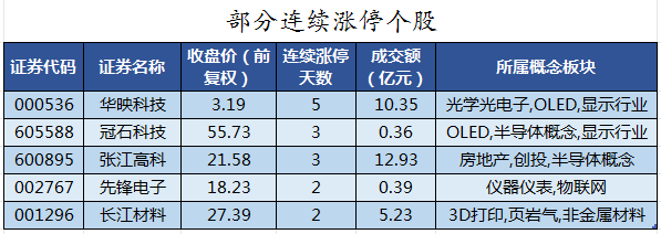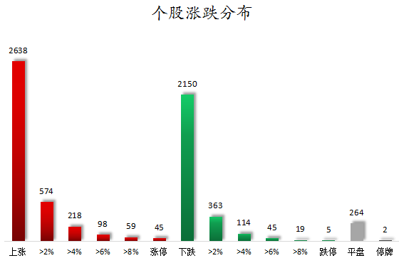 截至收盘,沪深两市合计2638只个股上涨,2150只个股下跌,平盘个股264只,停牌的个股2只。不含当日上市新股,共有45只个股涨停,5只个股跌停。连续涨停天数看,华映科技已连收5个涨停板,连续涨停板数量最多。