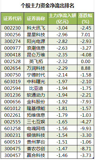 此外,3072只个股被主力资金净卖出,其中,33股被主力资金净卖出超1亿元。主力资金净流出最多的个股是科大讯飞,净流出金额为3.04亿元;主力资金净流出居前的个股还有星星科技、阳光电源、浪潮信息、昆仑万维、英飞拓,净流出金额分别为2.96亿元、2.82亿元、2.63亿元、2.35亿元、2.32亿元。