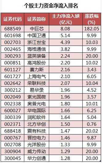 个股来看,今日有1957个股获主力资金净流入,其中,27股获主力资金净流入超1亿元。中巨芯获主力资金净流入最多,净流入金额为8.08亿元;主力资金净流入居前的个股还有中国卫通、浙江世宝、海格通信、蓝英装备、高鸿股份,流入金额分别为5.14亿元、4.39亿元、3.82亿元、2.24亿元、2.2亿元。