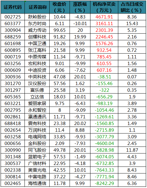 盘后龙虎榜数据显示,今日机构席位资金合计净卖出约4.18亿元。其中,净买入的个股9只,净卖出的个股17只。机构净买入最多的股票是跃岭股份,净买入金额约4671.91万元;机构净买入的居前还有东方时尚、威力传动、创耀科技等股。机构净卖出最多的股票是海格通信,净卖出金额约8242.29万元;机构净卖出居前的还有中富电路、奥普光电、广信材料、蓝箭电子、同飞股份等股。