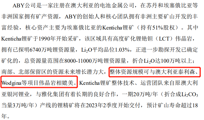 ABY公司核心资产主要为埃塞俄比亚的Kenticha锂矿,Kenticha锂矿的锂资源规模可与澳大利亚泰利森、Wodgina等项目伟晶岩相媲美。