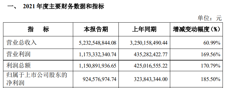 2021年度业绩快报显示,公司2021年实现营业总收入52.33亿元,同比增长60.99%;实现归属于上市公司股东的净利润9.25亿元,同比增长185.50%;基本每股收益0.81元。