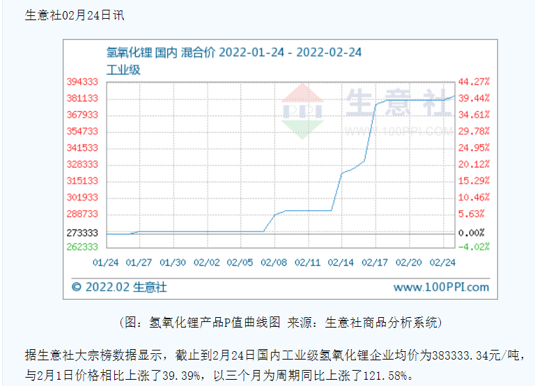 生意社大宗榜数据显示,截至2022年2月24日,国内工业级氢氧化锂均价为38.33万元/吨,与2022年2月1日价格相比上涨39.39%。生意社氢氧化锂分析师认为,目前上游碳酸锂上涨,提振市场信心,加之供需紧平衡,预计短期内,国内工业级氢氧化锂市场或将以坚挺运行为主。