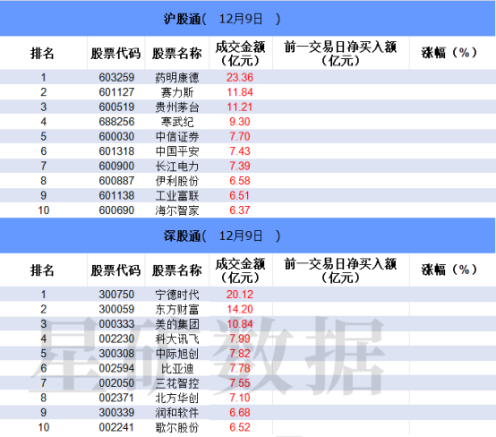 从沪股通前十大成交个股来看,药明康德位居首位;赛力斯和贵州茅台分居二、三位。